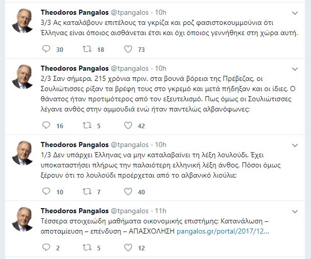 Ish-ministri grek, Theodoros Pangalos, ka shkaktuar një “tërmet” të vërtetë pas qëndrimit të tij të bërë publik në rrjetet sociale, ku deklaronte se suliotët ishin shqiptarë. Përmes rreshtave, të postuar në Twittter, ai nënvizon se suliotët, që hodhën foshnjat e tyre nga Zalogo, si sot e 215 vjet më parë, duke preferuar më mirë të vdisnin se sa poshtëroheshin, ishin tërësisht shqiptarë.