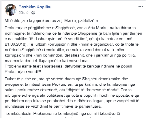 “Ta mbështesim Prokuroren e ta mbrojmë nga sulmi i taborëve të masmediave që paguhen për të shpifur, për të denigruar çdo zyrtar të ndershëm të këtij shteti, aq më tepër Prokuroren, që guxon t’u prishë oazet e qetësisë kriminale, paguesve të tyre, urdhëruesve: kapo të hajdutëve, të trafikantëve të drogave etj., hajdutë të tenderave, shkatërruesve të urbanistikës, të ambientit, të detit, të plazheve”, vijon më tej Kopliku, në një shënim në Facebook.