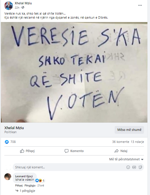 Drejtuesi politik i PD për qarkun e Dibrës në një postim në Facebook i drejtohet shqiptarëve me mesazhin: “Veresie s’ka, sko tek ai që shite votën”.