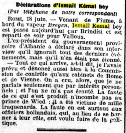 “L’Eclair” ka botuar, të premten e 19 qershorit 1914, në faqen n°4, reagimin Ismail Qemalit në lidhje me ngjarjet e fundit asokohe në Shqipëri, të cilin, Aurenc Bebja, nëpërmjet Blogut “Dars (Klos), Mat – Albania”, e ka sjellë për publikun shqiptar: