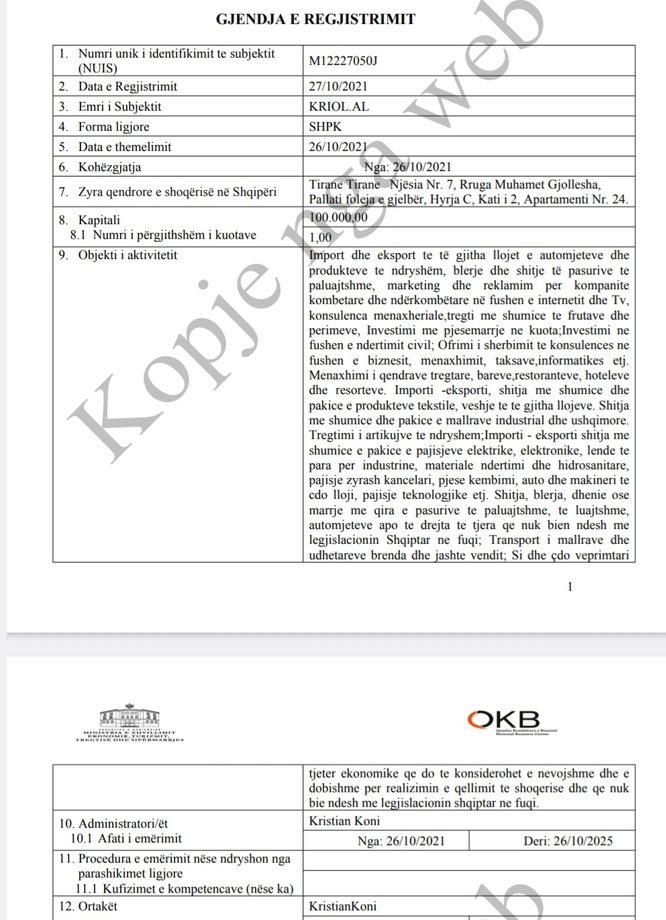 Sipas dokumenteve që hulumtoi VoxNews, në vitin 2021, Olsi Meta alias Kristian Koni, krijoi firmë Kriol.al. Firma ka si objekt eksportin e automjeteve, shit-blerje të pasurive të paluajtshme dhe reklamim për kompanitë kombëtare dhe ndërkombëtare në fushën e internetit. Madje, e njëjta kompani merret edhe me internet, televizion, konsulenca menaxheriale, tregti të frutave dhe perimeve apo edhe pjesëmarrje në kuota.