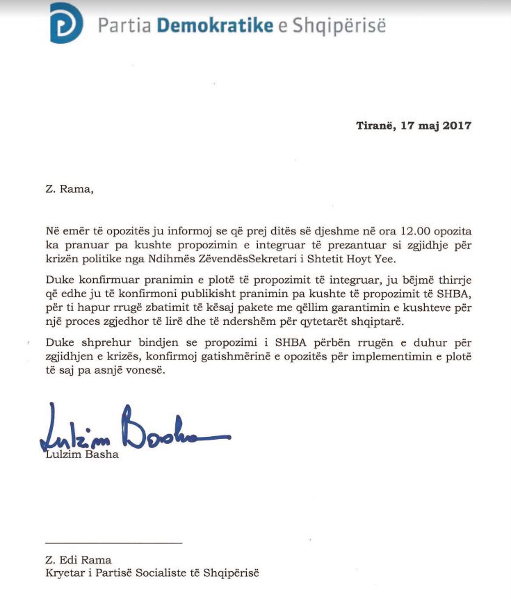 Kreu i PD shkruan se opozita ka pranuar që prej ditës së djeshme implementimin e marrëveshjes, ndërsa bën thirrje që edhe PS ta konfirmojë sa më parë.