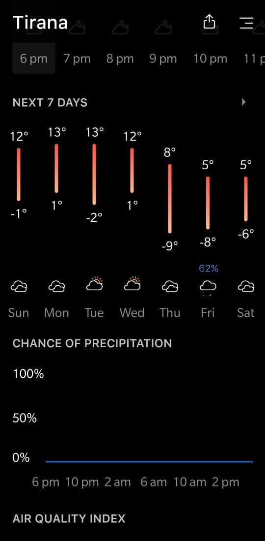 Nga parashikimi i aplikacioneve bien në sy temperaturat e ulëta që nisin orët e para të Janarit. Tirana pritet të preket nga i ftohti siberian, ku temperaturat do të shkojnë deri në -9 gradë celcius.