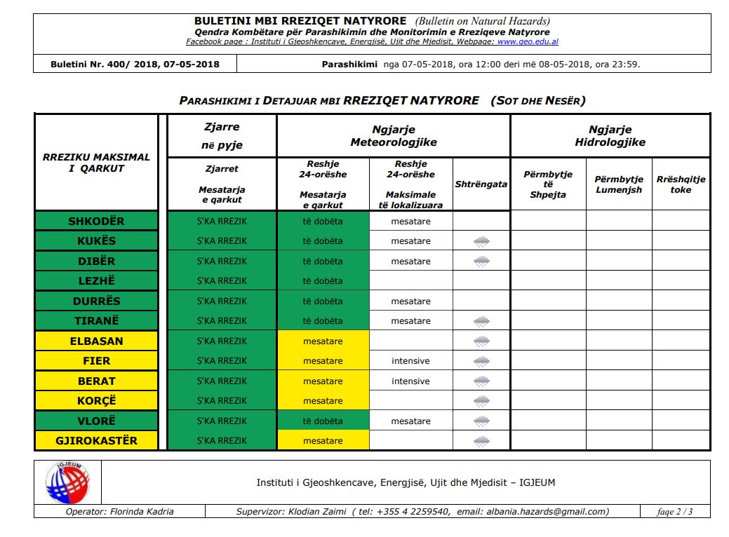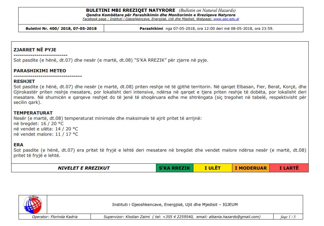 Bashkë me muajin Maj u rikthyen edhe reshjet e shiut në të gjithë territorin e vendit. Por ndërsa pritet që i gjithë muaji të karakterizohet nga vranësira dhe kthjellime, Instituti i Gjeshkencave sjell një parashikim më të detajuar, edhe për ditën e nesërme.