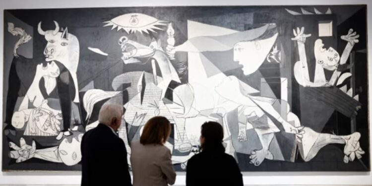 Mjeshtëria bardh e zi e Picasso-s paraqet dhunën e sulmit të kryer nga forcat ajrore italiane më 26 prill 1937, gjatë luftës civile spanjolle. Italia, aleate e gjeneralit Francisco Franco, e përdori bombardimin si një eksperiment të hershëm të bombardimeve ajrore ndaj civilëve.