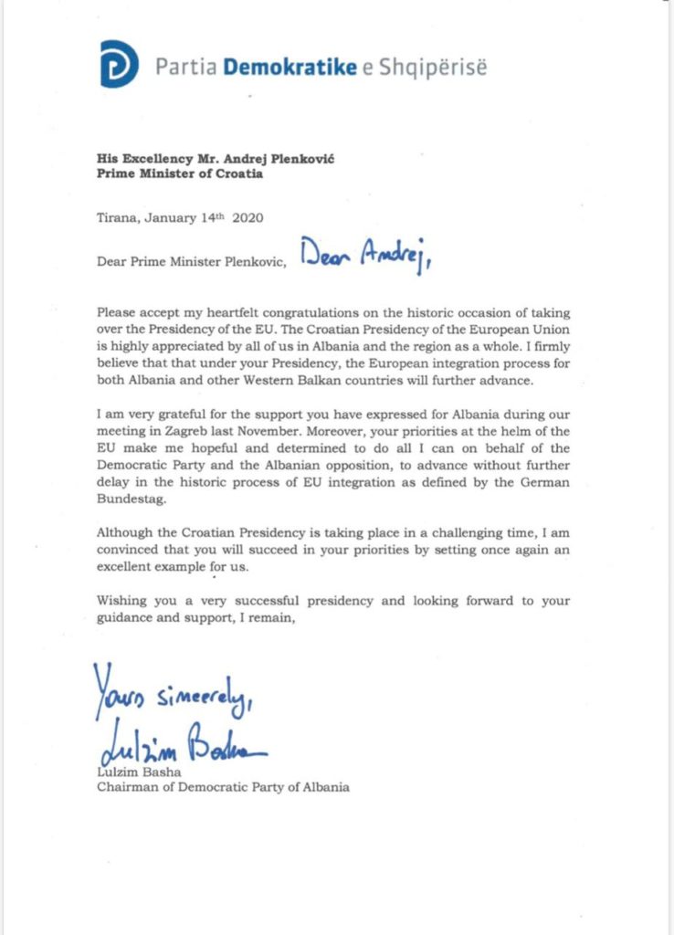 “Presidenca kroate e BE, është një arritje të cilën ne, në Shqipëri, e vlerësojmë shumë, ashtu si edhe rajoni. Kam bindjen e plotë se nën drejtimin tuaj të Presidencës, proceset integruese për Shqipërinë dhe vendet e Ballkanit Perëndimor, do të avancojnë edhe më tej. “– thekson zoti Basha në letrën e tij.