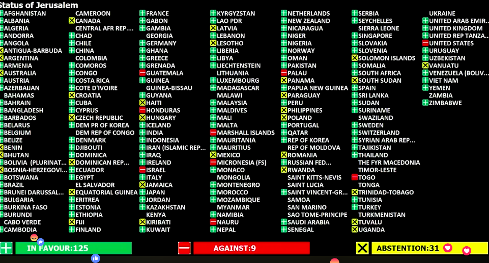 Shqipëria votoi pro rezolutës së Egjiptit përmes së cilës dënohej vendimi i SHBA për njohjen e Jeruzalemit si kryeqytet i Izraelit. Vendi ynë ishte mes 128 vendeve që votuan pro rezolutës e cila kundërshtohej ashpër nga SHBA. Ndërkohë, 35 shtete abstenuan ndërsa 9 votuan kundër rezolutës.