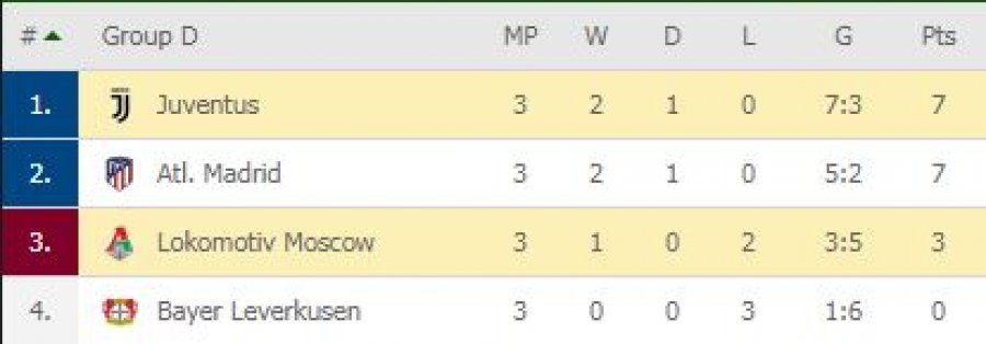 Në këtë grup, Juve e Atletico prijnë me nga shtatë pikë. Lokomotiva e Moskës ka tri e Bayer Leverkuseni s’ka pikë.