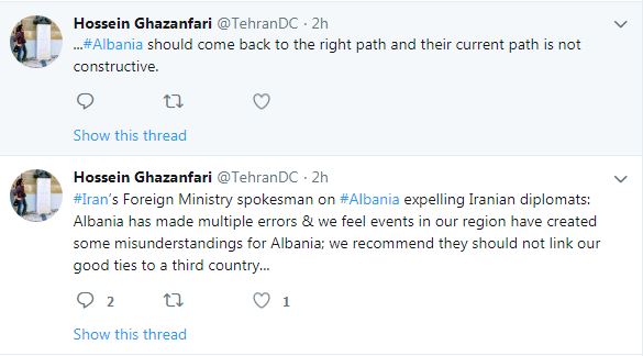 “Zëdhënësi i Ministrisë së Jashtme të Iranit në #Albania duke dëbuar diplomatët iranianë: Shqipëria ka bërë disa gabime dhe ne ndiejmë se ngjarjet në rajonintonë kanë krijuar disa keqkuptime për Shqipërinë; ne rekomandojmë që ata të mos lidhin marrëdhëniet tona të mira me një vend të tretë … Shqipëria duhet të kthehet në rrugën e duhur dhe rruga e tyre e tanishme nuk është konstruktive”, thotë zëdhënësi i Minsitrisë së Jashtme të Iranit.