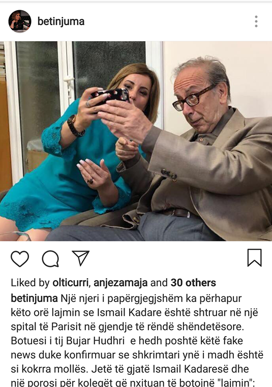 “Një njeri i papërgjegjshëm ka përhapur këto orë lajmin se Ismail Kadare është shtruar në një spital të Parisit në gjendje të rëndë shëndetësore. Botuesi i tij Bujar Hudhri e hedh poshtë këtë “fake news” duke konfirmuar se shkrimtari ynë i madh është si kokrra e mollës. Jetë të gjatë Ismail Kadaresë…”,–shkruan gazetarja në postimin e saj duke shtuar se dhe vetë Kadare është habitur nga ky lajm.