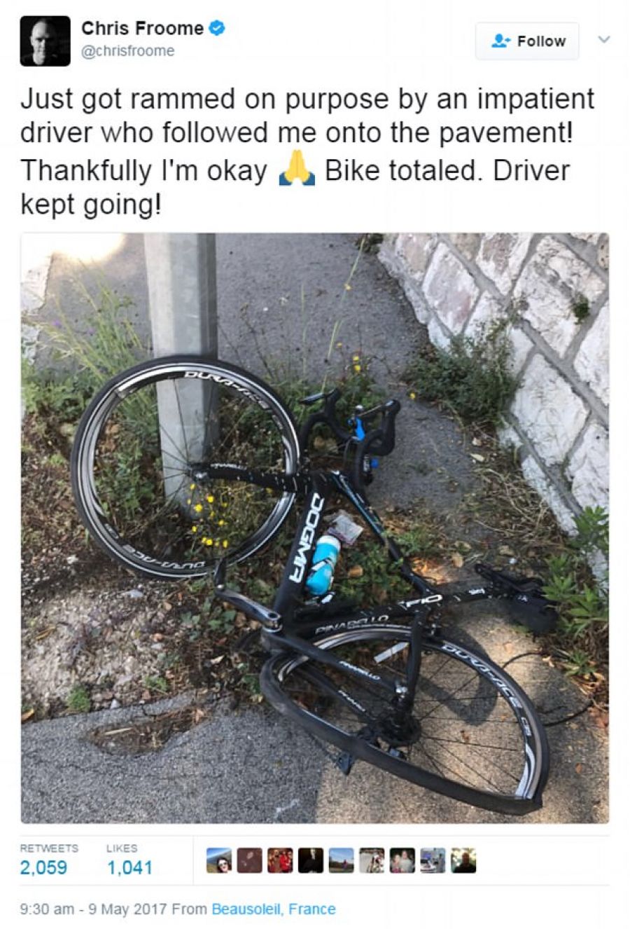 Në një postim në Tëitter ai ka thënë se është mirë, por biçikleta e tij ishte dëmtuar plotësisht nga goditja e veturës, përgatiti Express. (b.an)