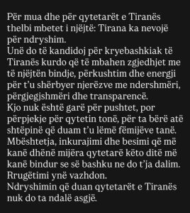 Florian Binaj, kandidat për bashkinë e Tiranës ka reaguar në rrjetet sociale pas vendimit të Gjykatës Kushtetuese, vendim i cili ishte në favor të Erion Veliajt, teksa ky i fundit do vazhdojë të mbajë postin e krybashkiakut të Tiranës.