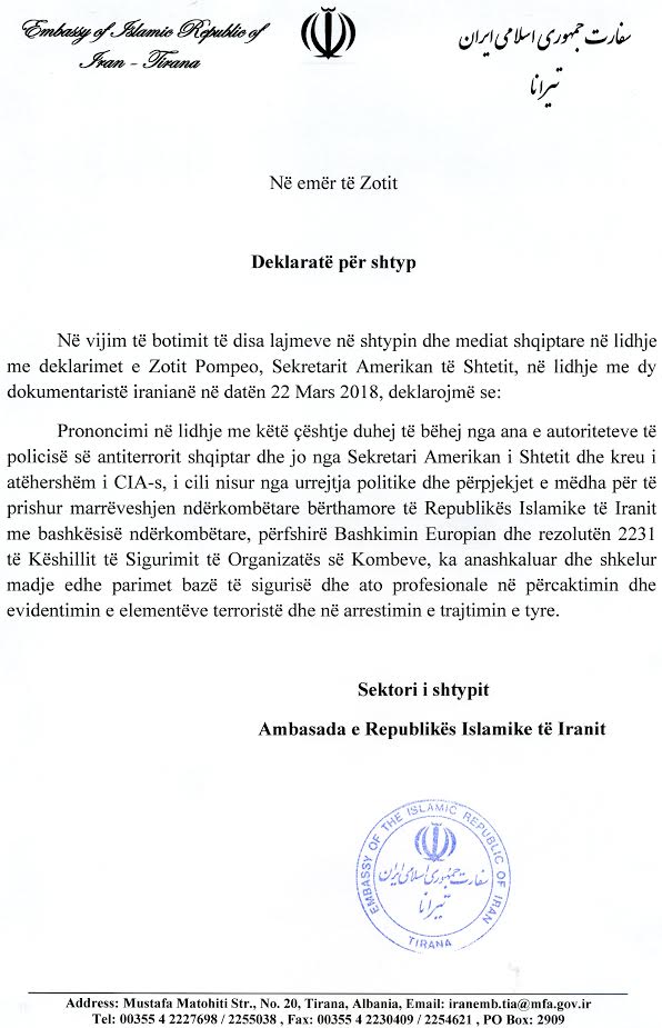 Ambasada e Iranit në Tiranë ka reaguar në lidhje me arresimin e dy iranianëve, në datë 22 mars 2018, të dyshuar si terroristë.