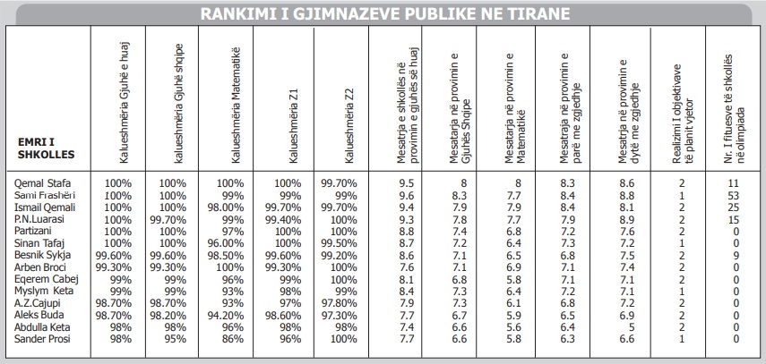 Pas tre vitesh në top listë, “Sami Frashëri” zbret nga piedestali si gjimnazi më i mirë publik në Tiranë. Vendin e tij për 2017-2018 e zë “Qemal Stafa”, e renditur gjithnjë si ndër më të mirat, por që asnjëherë nuk kishte njohur kryesimin. Në dokumentin e siguruar nga gazeta, rezulton se ashtu si edhe vitin e kaluar “Ismail Qemali” e “Petro Nini Luarasi” kanë mbetur në vendnumëro, duke u renditur përkatësisht në vendin e tretë dhe të katërt, ndjekur nga të mesmet, “Partizani” dhe “Sinan Tafaj”, të cilët, ndryshe nga dy të lartpërmendurit, kanë njohur rritje performance, duke u ngjitur me dy vende nga viti i kaluar. Në fund të gjimnazeve më të mirë të Tiranës qëndrojnë shkollat “Abdullah Keta” dhe “Sandër Prosi”, thuajse në të njëjtin nivel si më parë.