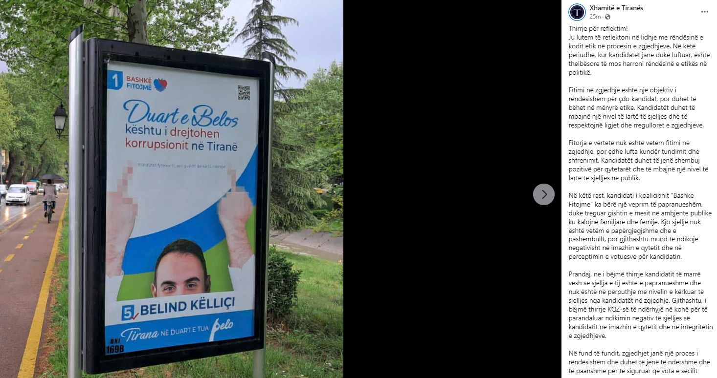 Përmes një reagimi, Xhamitë e Tiranës nënvizojnë se kandidati i koalicionit “Bashkë Fitojmë” ka bërë një veprim të papranueshëm, duke treguar gishtin e mesit në ambiente publike ku kalojnë familjare dhe fëmijë. Më tej në reagim thuhet se kjo sjellje nuk është vetëm e papërgjegjshme dhe e pashembullt, por gjithashtu mund të ndikojë negativisht në imazhin e qytetit dhe në perceptimin e votuesve për kandidatin.