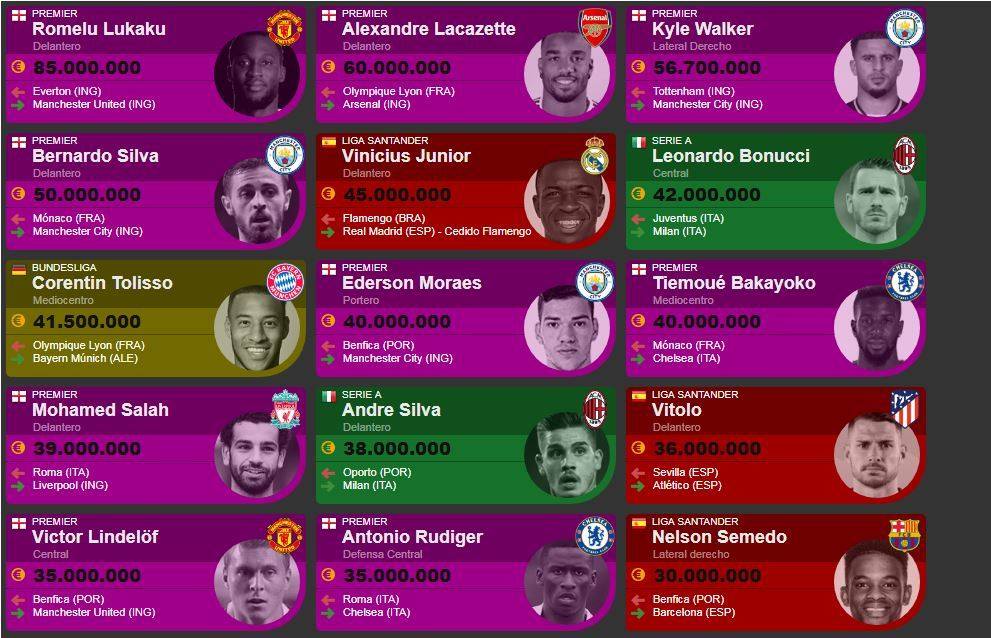 Marca ka publikuar një listë të gjatë të lojtarëve të transferuar deri më tani gjatë verës.Romelu Lukaku (85 milionë euro), Alexandre Lacazette (60 milionë euro) dhe Kyle Walker (56 milionë euro) janë transferimet më të shtrenjta të këtij afati kalimtar.