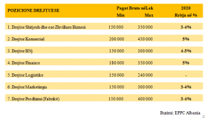 Për pozicionet drejtuese, më të paguarit janë drejtorë komercial, nga 200-450 mijë lekë në muaj, me një rritje të pritshme prej 5% sipas EPCC. Drejtorët e shitjeve, marketingut, burimeve njerëzore, logjistikës paguhen minimalisht 150 mijë lekë dhe për ata me përvojë deri në 300-350 mijë lekë. Edhe për drejtorët e prodhimit nëpër fabrika, paga arrin deri në 400 mijë lekë në muaj, duke qenë ndër punët më të paguara.