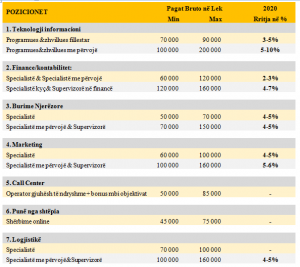 Për ekonomistët, kontabilistët, marketingun, call center, programuesit, IT madje edhe për punët nga shtëpia, kërkesa nuk do mungojë, me paga që variojnë nga 45 mijë lekë/muaj (punë nga shtëpia), në 200 mijë lekë (programues me përvojë).