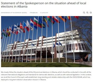 Në një deklaratë të zëdhënësit KiE-së për situatën para zgjedhjeve lokale në Shqipëri të publikuar në faqen zyrtare në internet, ky organizëm bën të qartë se zgjedhjet vendore të së dielës duhet të zhvillohen në përmbushje të të gjitha detyrimeve dhe standardeve ndërkombëtare të zgjedhjeve dhe në përputhje të plotë me legjislacionin shqiptar.