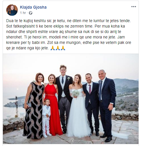 “Dua të të kujtoj kështu siç je këtu, në ditën më të lumtur të jetës tënde. Sot fatkeqësisht ti ke bërë eklips në zemrën time. Për mua koha ka ndalur dhe shpirti është vrarë aq shumë sa nuk di se si do arrijë të shërohet. Ti je heroi im, modeli më i mirë që unë mora në jetë. Jam krenare për ty babi im. Zot sa më mungon, edhe pse ke vetëm pak orë që je ndarë nga kjo jetë. 🙏🙏🙏”, shkruan Gjosha. /e.s/