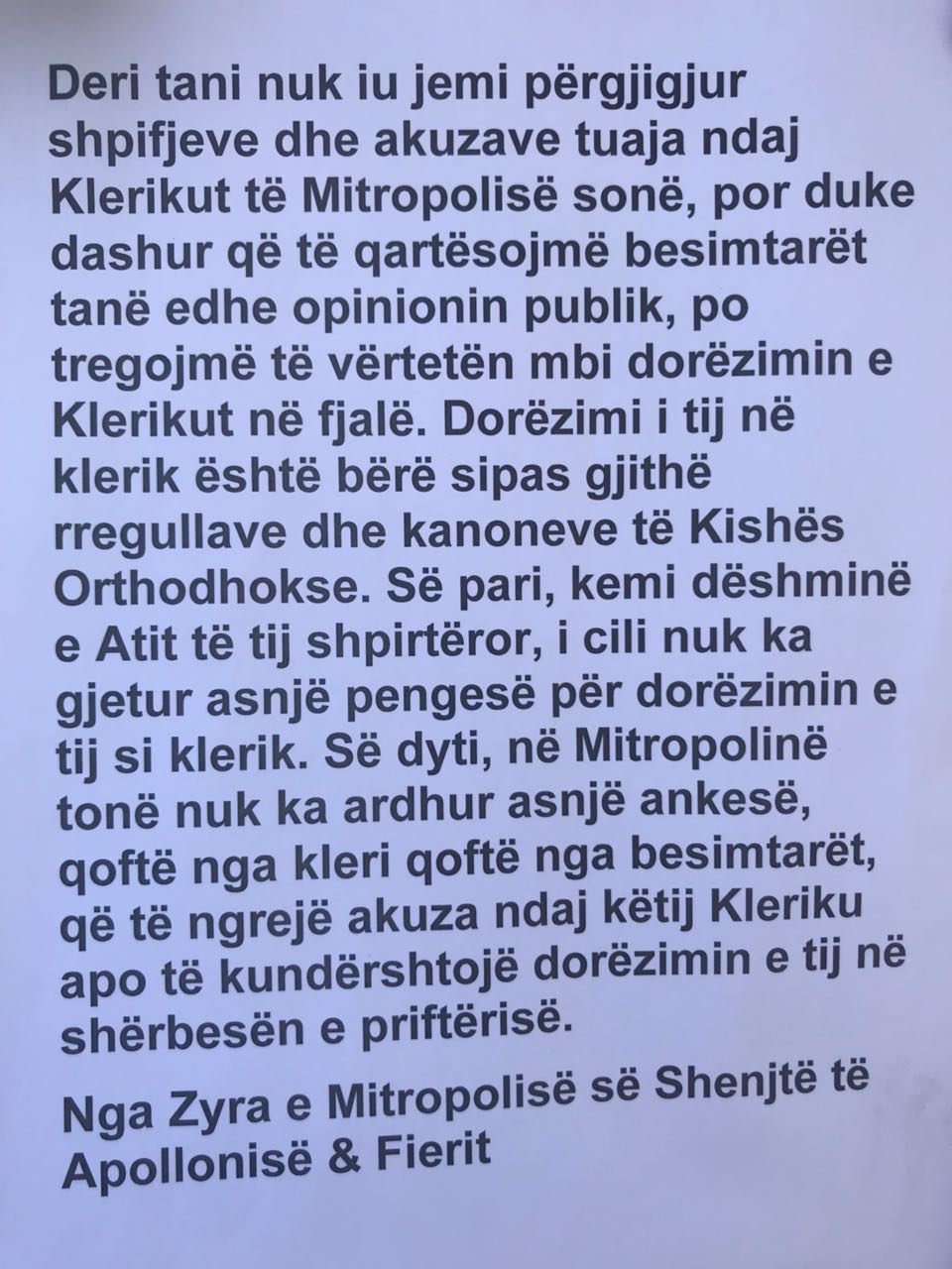 Deri tani nuk iu jemi pёrgjigjur shpifjeve dhe akuzave tuaja ndaj Klerikut tё Mitropolisё sonё, por duke dashur qё tё qartёsojmё besimtarёt tanё edhe opinionin publik, po tregojmё tё vёrtetёn mbi dorёzimin e Klerikut nё fjalё. Dorёzimi i tij nё klerik ёshtё bёrё sipas gjithё rregullave dhe kanoneve tё Kishёs Orthodhokse. Sё pari, kemi dёshminё e Atit tё tij shpirtёror, i cili nuk ka gjetur asnjё pengesё pёr dorёzimin e tij si klerik. Sё dyti, nё Mitropolinё tonё nuk ka ardhur asnjё ankesё, qoftё nga kleri qoftë nga besimtarёt, qё tё ngrejё akuza ndaj kёtij Kleriku apo tё kundёrshtojё dorёzimin e tij nё shёrbesёn e priftёrisё.