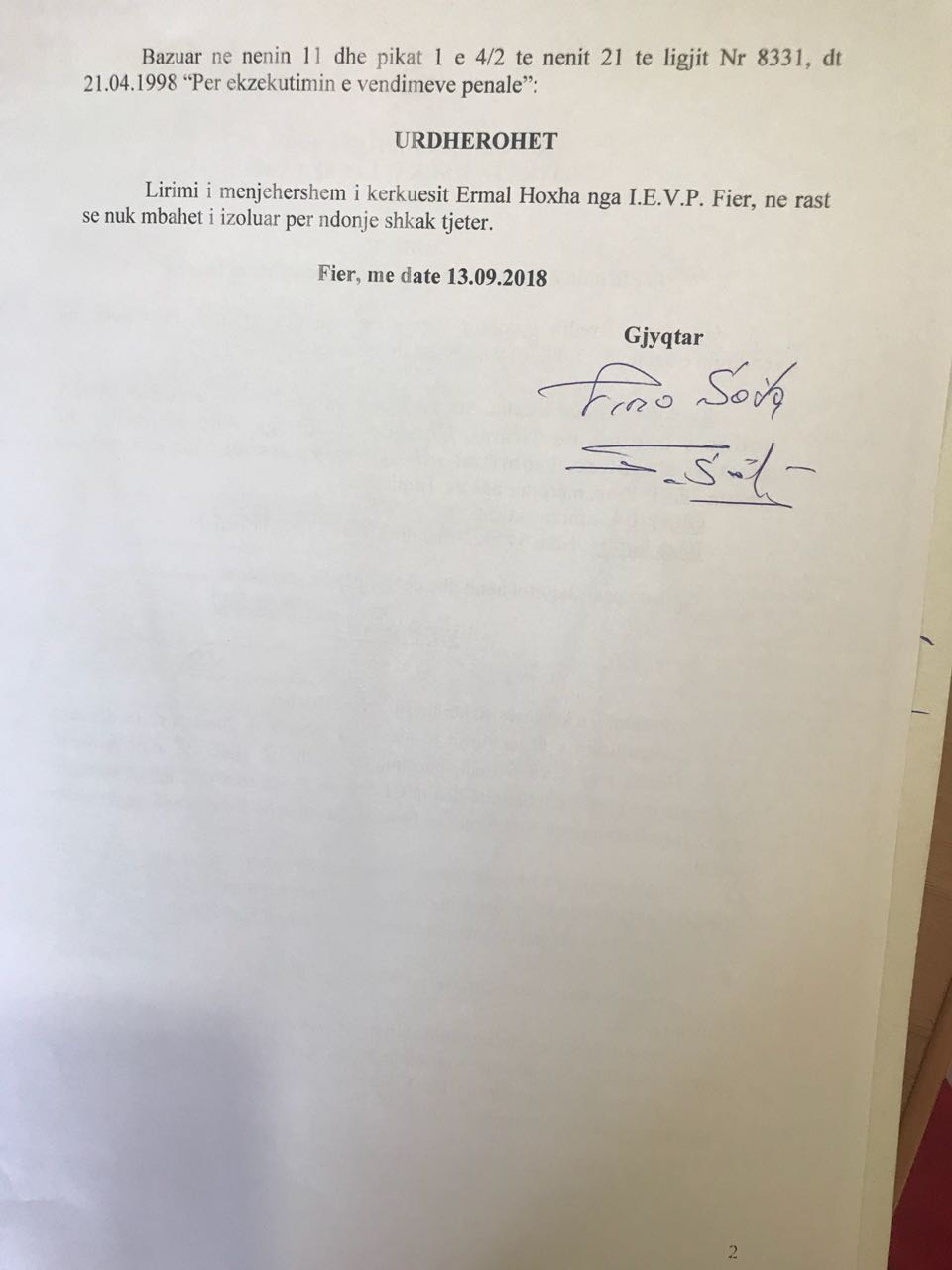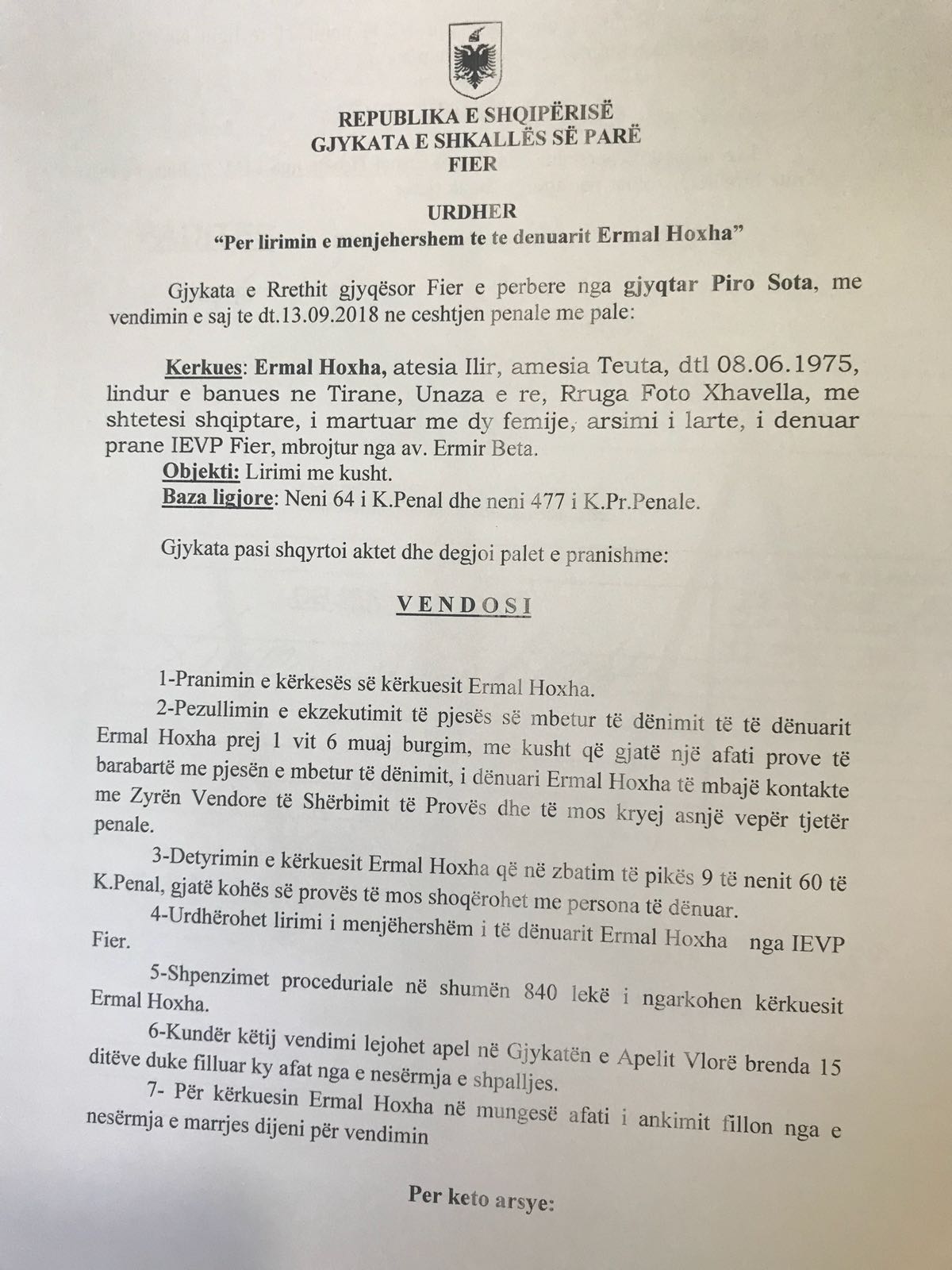 Zbulohet vendimi që liroi nga burgu, nipin e Enver Hoxhës, Ermal Hoxha. Vendimi i firmosur më datë 13 shtator, mban firmën e gjyqtarit të Gjykatës së Fierit Piro Sota. Sipas vendimit, te siguruar nga gazetari Ervi Kuçi, trupi gjykues ka pranuar kërkesën e Ermal Hoxhës për pezullimin e ekzekutimit të pjesës së mbetur të dënimit të të dënuarit, me kusht që gjatë një afati prove të barabartë me pjesën e mbetur të dënimit, i dënuari Ermal Hoxha të mbajë kontakte me Zyrën Vendore të Shërbimit të Provës dhe të mos kryejë asnjë vepër tjetër penale