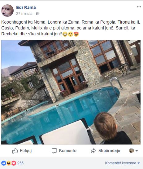 Me anë të një fotoje të postuar në profilin e tij në Facebook, shfaqet edhe i biri Zaho. Në foto duket edhe restoranti në zonën e Surrelit të cilit kryeministri nuk ia ka kursyer reklamën.
