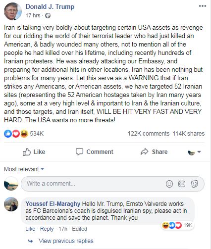 Në një postim të Donald Trump në lidhje me vrasjen e gjeneralit Iranian, një tifoz ka komentuar: