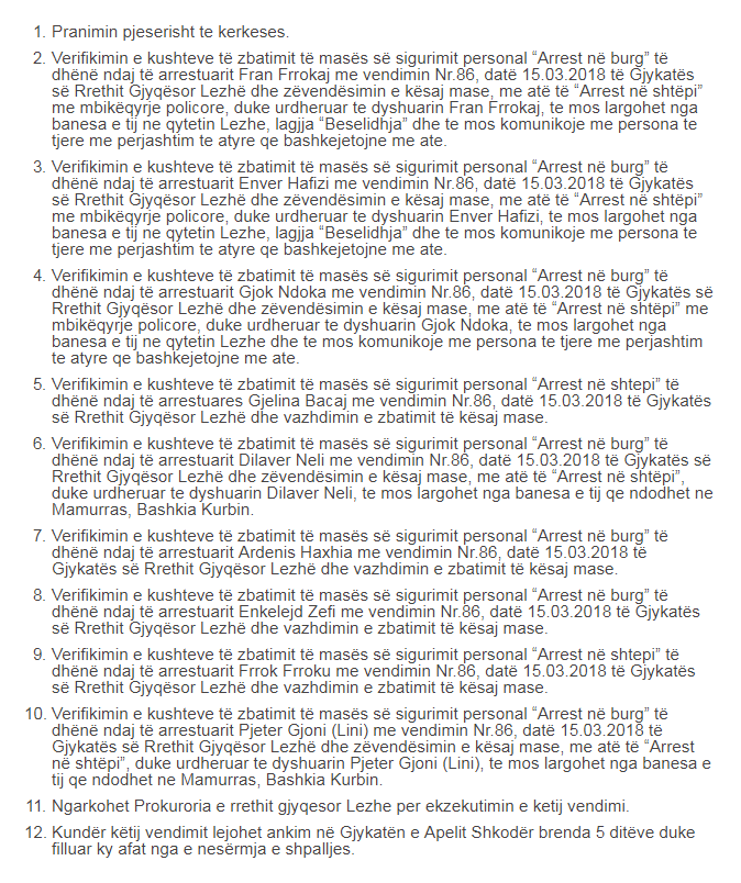Kjo është një pjesë e verdiktit të dhënë nga Gjykata e Lezhës sot për zyrtarët e Bashkisë që akuzohen për tjetërsimin e pronave në bregdetin e Shëngjinit në seancën e rivlerësimit të masës së sigurisë nga arrest me burg në arrest shtëpie.