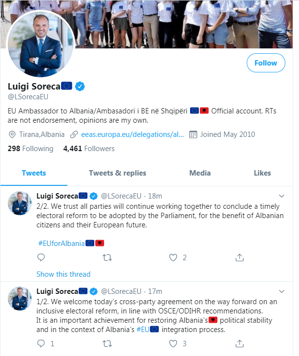 “Ne mirëpresim marrëveshjen e sotme ndër-partiake mbi rrugën përpara për një reformë gjithëpërfshirëse zgjedhore, në përputhje me rekomandimet e OSBE / ODIHR. Është një arritje e rëndësishme për rivendosjen e stabilitetit politik të Shqipërisë dhe në kontekstin e procesit të integrimit të # BE të Shqipërisë“, theksoi ambasdori i BE.