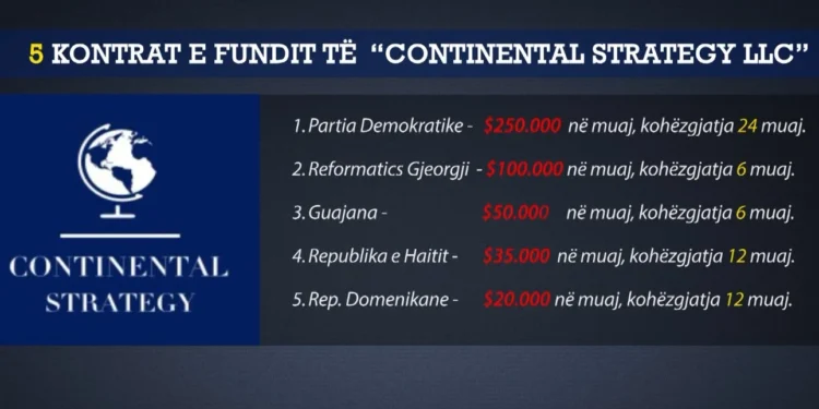 Nga një kërkim i gazetarit të Top Channel Muhamed Veliu, në faqen FARA ku janë regjistruar dhe publikojnë kontratat kompanitë lobuese amerikane rezulton se në periudhën Shkurt Prill 2025 kompania “Continental Strategy LLC” ka lidhur 5 kontrata ku në vend të parë me shumën 250.000 dollarë në muaj renditet PD e Shqipërisë.