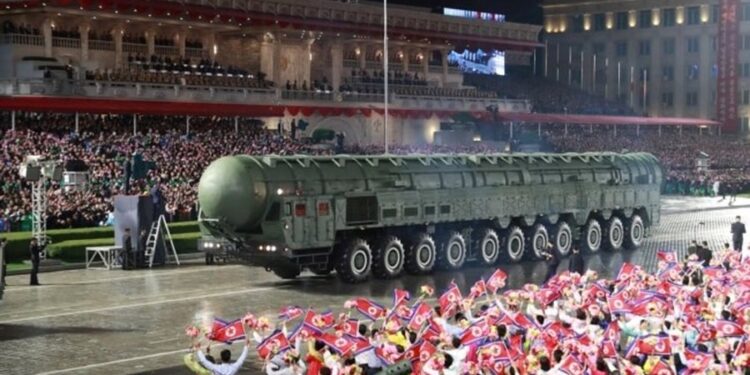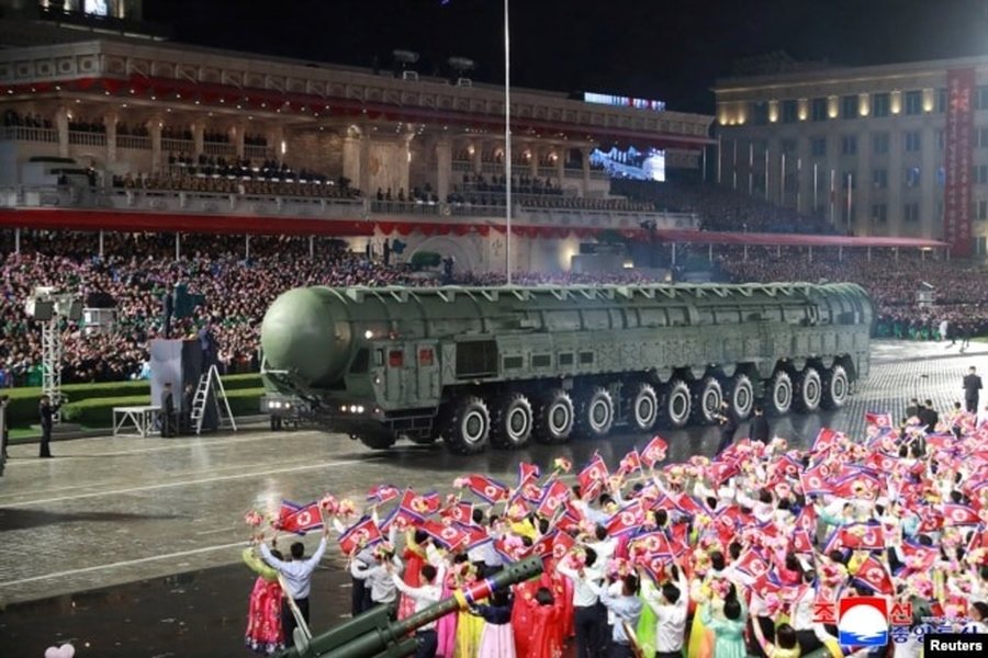 Lideri i Koresë së Veriut, Kim Jong Un, udhëhoqi një paradë të madhe ushtarake, në të cilën u shfaq raketa e re balistike ndërkontinentale para personaliteteve të ftuara ndërkombëtare, raportoi të shtunën media shtetërore, KCNA.