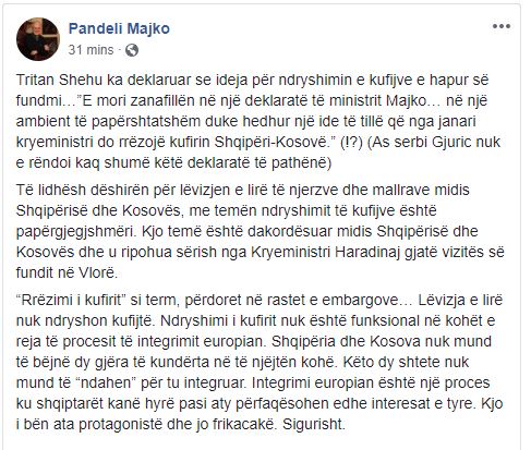 “’Rrëzimi i kufirit’ si term, përdoret në rastet e embargove… Lëvizja e lirë nuk ndryshon kufijtë. Ndryshimi i kufirit nuk është funksional në kohët e reja të procesit të integrimit evropian. Shqipëria dhe Kosova nuk mund të bëjnë dy gjëra të kundërta në të njëjtën kohë. Këto dy shtete nuk mund të ‘ndahen’ për t’u integruar. Integrimi europian është një proces ku shqiptarët kanë hyrë pasi aty përfaqësohen edhe interesat e tyre. Kjo i bën ata protagonistë dhe jo frikacakë. Sigurisht”, shkruan më tej Pandeli Majko në reagimin e tij ndaj Tritan Shehut.