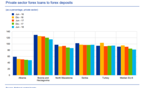 Banka qendrore Europiane në një vlerësim që për zhvillimet gjatë 10 viteve të fundit (2008-2018) në bankat e Ballkanit Perëndimor dhe Turqi vuri në dukje vuri në dukje se në krahasim me rajonin, Shqipëria ka raportin më të ulët të kredisë ndaj depozitave dhe raportin më të ulët të aktiveve të sistemit bankar ndaj PBB-së.