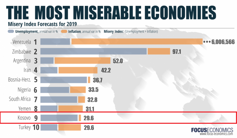 Punësimet familjare, krimi dhe korrupsioni, niveli i lartë i papunësisë e inflacionit dhe ikja e të rinjve në masë të madhe, bëjnë që Kosova të renditet në top dhjetëshen e vendeve që do të kenë ekonominë më të mjerueshme përgjatë vitit 2019-të. Kjo është konstatuar nga ‘Focus Economics’ në analizën e tyre të bërë për 130 vende të botës, të cilën e quajnë ‘Indeksi i Mjerimit’.