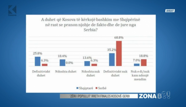 Rreth 48% e shqiptarëve janë pergjigjur se nuk e duan bashkimin e Kosovës me Shqipërinë, ndërsa 43% duan që ky bashkim të ndodhë.