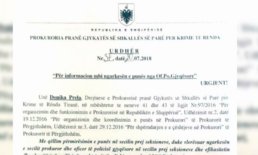 Kur ka mbushur dy muaj në krye të Krimeve të Rënda , Donika Prela kërkon të informohet se cilët janë peshqit e mëdhenj dhe peshqit e vegjël që po hetohen brenda godinës së qelqtë. Përmes këtij urdhri të firmosur në datën 20 korrik , Prela kërkon që brenda ditës të informohet me shkrim nga çdo oficer i policisë gjyqësore për dosjet dhe emrat e shtetasve që janë nën hetim si edhe për veprën për çfarë po hetohen.