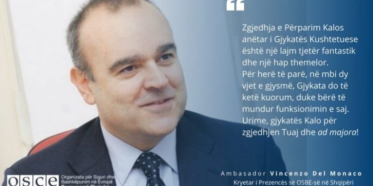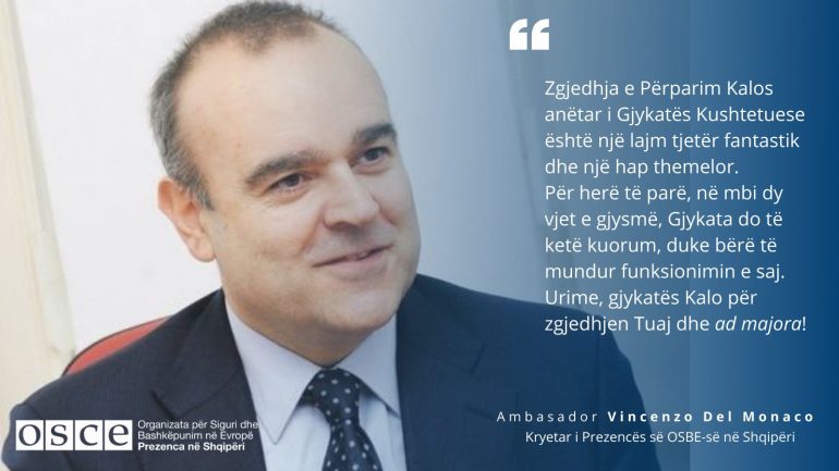 Kryetari i Prezencës së OSBE-së në vendin tonë, Vincenzo Del Monaco ka reaguar pas plotësimit të kuorumit në Gjykatën Kushtetuese, e cila bëhet tashmë funksionale me zgjedhjen e anëtarit të gjashtë, Përparim Kalo.