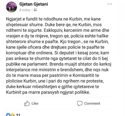 Përmes një statusi në rrjetet sociale, ai ka kritikuar policinë teksa thotë se drejtuesit e saj në Kurbin janë të paaftë.