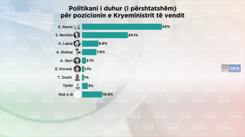 Pas tij me radhë 24.1% Sali Berisha, 8.6% Adriatik Lapaj, 7.6% Agron Shehaj, 2.1% Arlind Qori, 1.1% Elena Kocaqi, 1% Tom Doshi dhe 10.6% janë përgjigjur nuk e di.