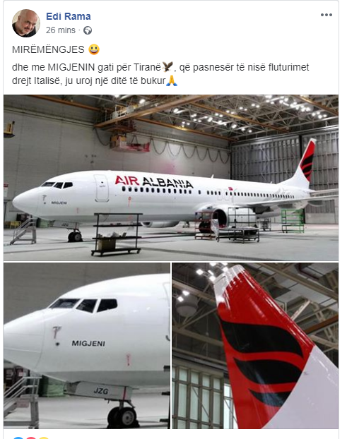Bëhet fjalë për avionin me emrin “Migjeni”, i cili sipas fotove duket ende në hangar por Rama thotë se është gati për në Tiranë dhe se pas dy ditësh nis fluturimet drejt Italisë.