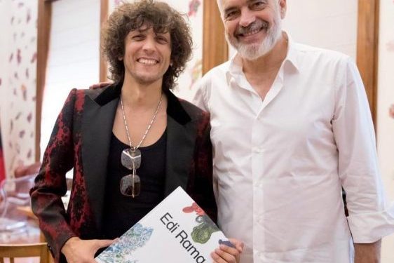Ndërkohë, në foto shihet se këngëtari i famshëm në Itali mban në dorë një bllok të dhuruar nga kryeministri Rama, siç duket, me veprat artistike të këtij të fundit.
