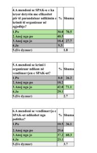 Ndër 120 pyetjet e pyetësorit, ishin edhe 6 pyetje specifike për SPAK-un. Përgjigjiet për to shënojnë kuota rekord të SPAK-ut në opinionin publik (dhe shumë më të larta se të çdo institucioni tjetër shtetëror).