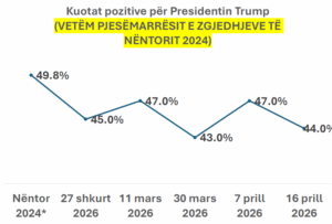 Kështu, më 27 shkurt, vetëm 45% e pjesëmarrësve të zgjedhjeve të nëntorit 2024 kishin vlerësim pozitiv ose shumë pozitiv për punën e Presidentit Trump. Më 11 mars Trump u ngjit në 47%, ra në 43% më 30 mars, u ringjit në 47% më 7 prill, duke përfunduar në 44% më 16 prill. Pra, nga 49.8% që e votuan atë në zgjedhje, vetëm 44% e vlerësojnë punënë e tij pozitivisht…