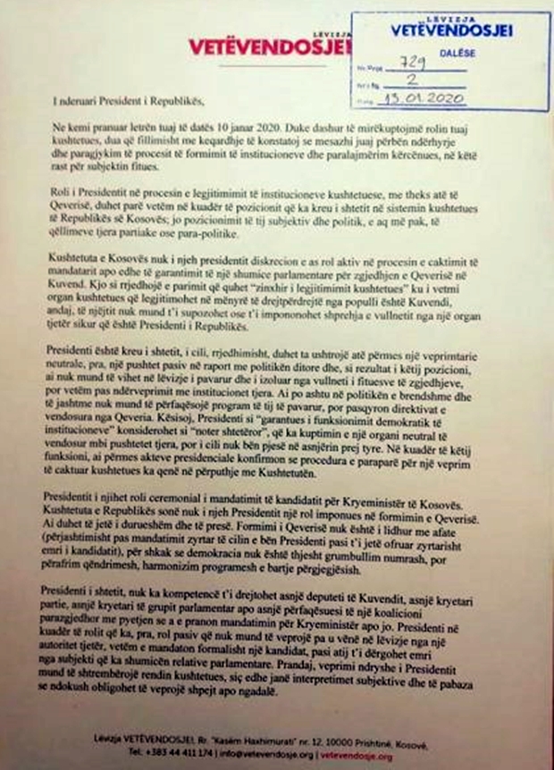 “Duhet pasur parasysh edhe pikën 87 të Aktgjykimit të Gjykatës Kushtetuese, e cila vërën ‘se nuk përjashtohet që partia ose koalicoini në fjalë do të refuzoj të marrë mandatin’. Në cilin do rast, të pranimit ose refuzimit të propozimit të kandidatit/es për kryeministër, luteni që të më njoftimin sa më shpejt, sipas premtimit tuaj nga takimi ynë, në mënyrë që unë të ndërmarrë hapat e përcaktuar me Kushtetutë dhe të dekretoj kandidatin/en për kryeministër për të formuar Qeverinë e Republikës së Kosovës”, shprehej Thaçi.