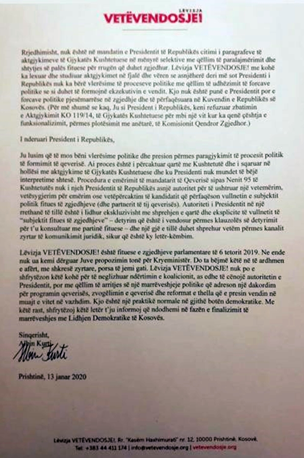 Kreu i Lëvizjes Vetëvendosje, Albin Kurti me anë të një letre i ka kthyer përgjigje presidentit të Kosovës, Hashim Thaçi ku i ka kërkuar që të mos bëjë presion për krijimin e qeverisë së re.