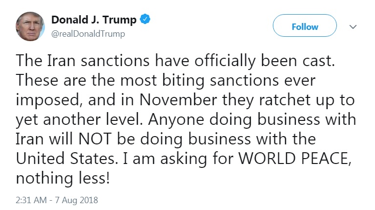 Presidenti i SHBA Donald Trump ka bërë një paralajmërim të fortë për të gjithë partnerët tregtarë që bëjnë biznes me Iranin, pas ri-vendosjes së sanksioneve ndaj këtij shteti. “Kushdo që bën biznes me Iranin nuk do të bëjë me Shtetet e Bashkuara”, -shkroi presidenti Trump në Twitter.