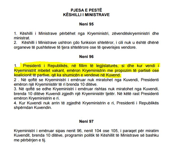 Por, çfarë parashikon kushtetuta, e cila është busulla e presidentit të republikës. Në kapitullin e pestë ku flitet për Këshillin e Ministrave, përcaktohet edhe mandatimi i kryeministrit. Në pikën 1, të nenit 96 shprehimisht thuhet: