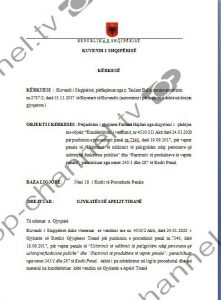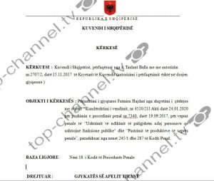 Kuvendi i Shqipërisë duke vleresuar se vendimi i Gjykatës së Rrethit Gjyqësor Tiranë për pushimin e procedimit penal nr.7340, datë 19.09.2017, për veprat penale të “Ushtrimit të ndikimit të paligjshëm ndaj personave që ushtrojnë funksione publike” dhe “Pastrimit të produkteve të veprës penale”, parashikuar nga nenet 245/1 dhe 287 të Kodit Penal, është i pa mbështetur në ligjin procedurial dhe atë material ka kundërshtuar këtë vendim në Gjykatën e Apelit Tiranë .