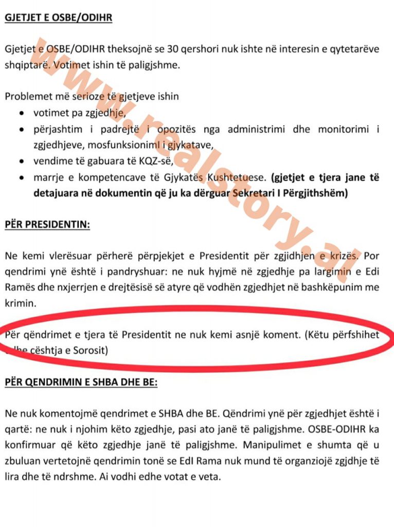 “Për qëndrimet e tjera të presidentit ne nuk kemi asnjë koment. Këtu përfshihet edhe çështja e Sorosit”, shkruhet qartë me germa të zeza në dokument.
